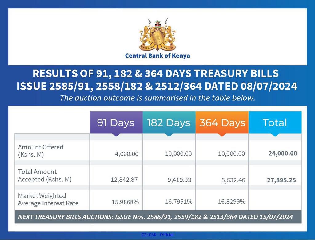 The CBK had offered Sh24 billion across three maturities: 91 days, 182 days, and 364 days.