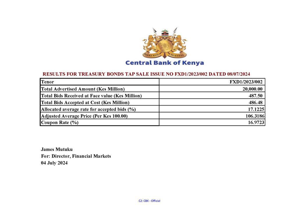 The CBK's Treasury Bonds Tap Sale, Issue No. FXD1/2023/002, targeted to raise Sh20 billion.