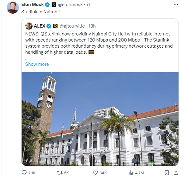 Musk took to X to react to news reports about Nairobi City County’s implementation of Starlink as a backup internet link for its Customer Service Centre.