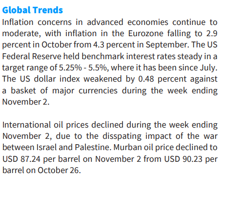 "International oil prices declined during the week ending November 2, due to the dissipating impact of the war between Israel and Palestine. Murban oil price declined to USD 87.24 per barrel on November 2 from USD 90.23 per barrel on October 26," the CBK report stated.