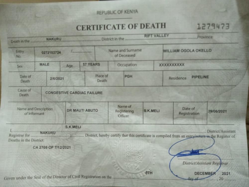 - If there's a previous death certificate from the country where the person died, verification will be done through the Kenyan Embassy there.