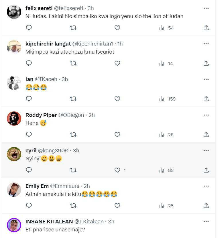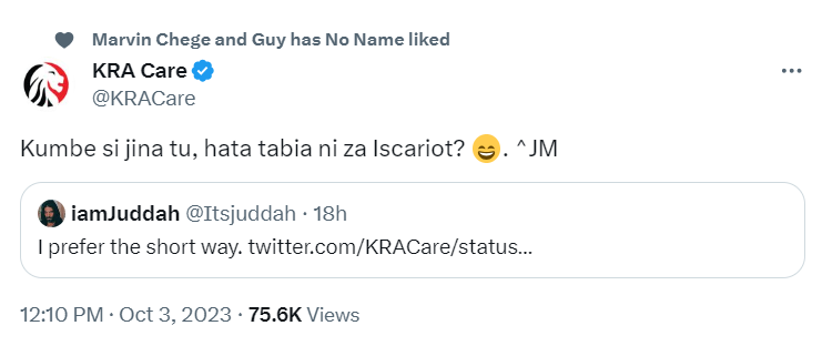 This led to an unexpected twist in the conversation, with KRA responding with a touch of humour, asking, "Kumbe si jina tu, hata tabia ni za Iscariot?" - a witty remark suggesting that there might be more to the user's name and behaviour than meets the eye.