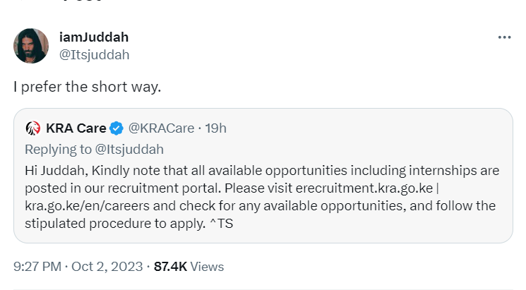 It all began when an X user, @Itsjuddah, tagged KRA on a thread in which Kenyans were stating their dream job opportunities.