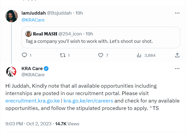 Seizing the moment, KRA responded with professionalism, directing the user to their official recruitment portal and urging them to follow the stipulated procedures for application.