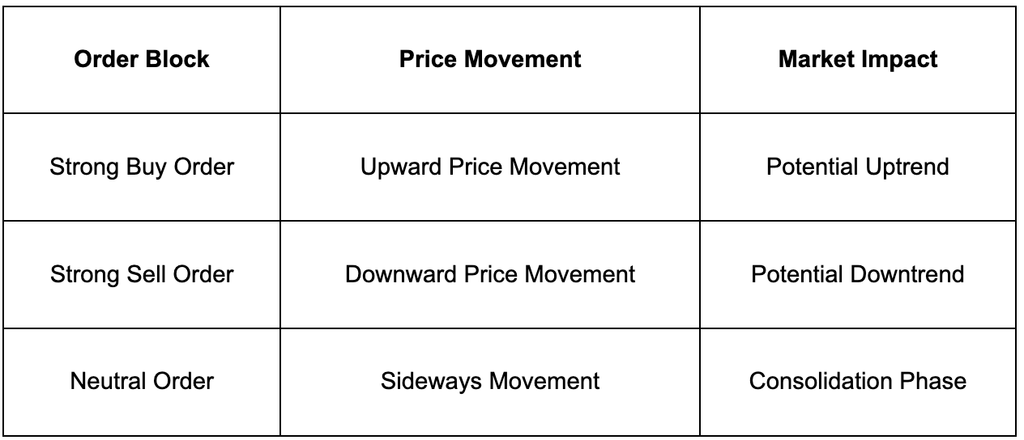 The above table shows how the knowledge of order blocks may give us the information that will be of use in forecasting the future movements. By finding these blocks, a trader can start doing a trade that simply conforms to the idea of smart money.