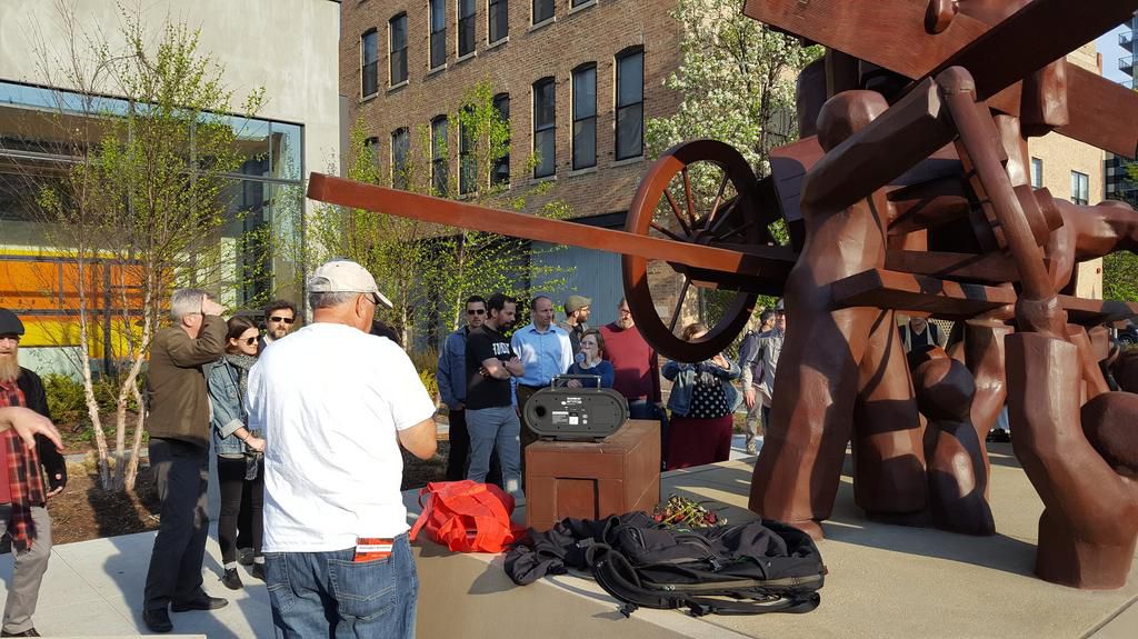 Labour activist and tour guide Larry Spivack speaks to Union of Democratic Communications conference-goers at the Haymarket Memorial in Chicago in 2018 [Image Credit: Weave News]