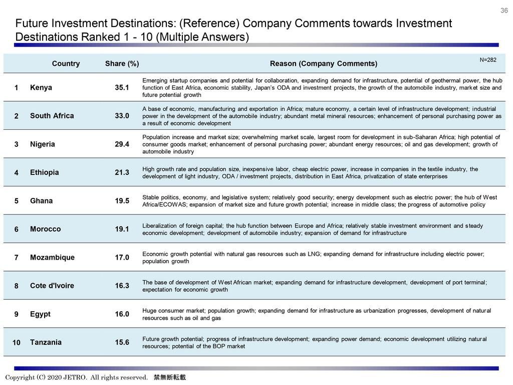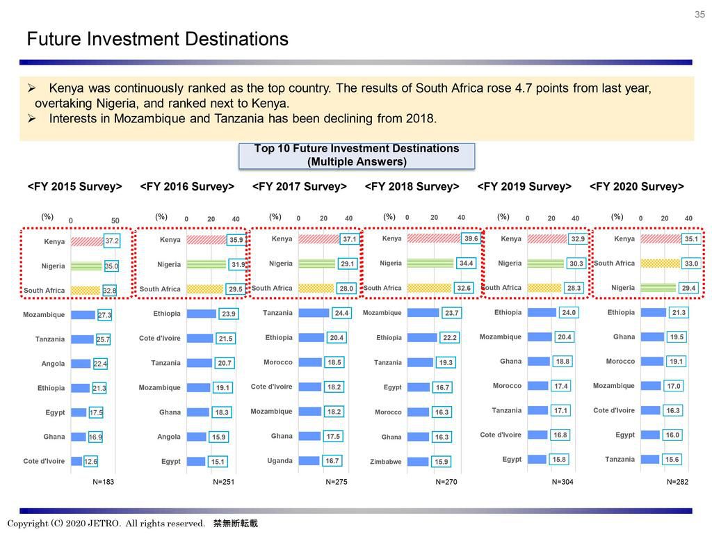 Africa has attracted significant investments and has received an estimated $20 billion in direct investment from Japan between 2016-2018. According to a survey by Japan External Trade Organisation (Jetro), Kenya has been ranked first on top future investment destinations for Japanese investors.
