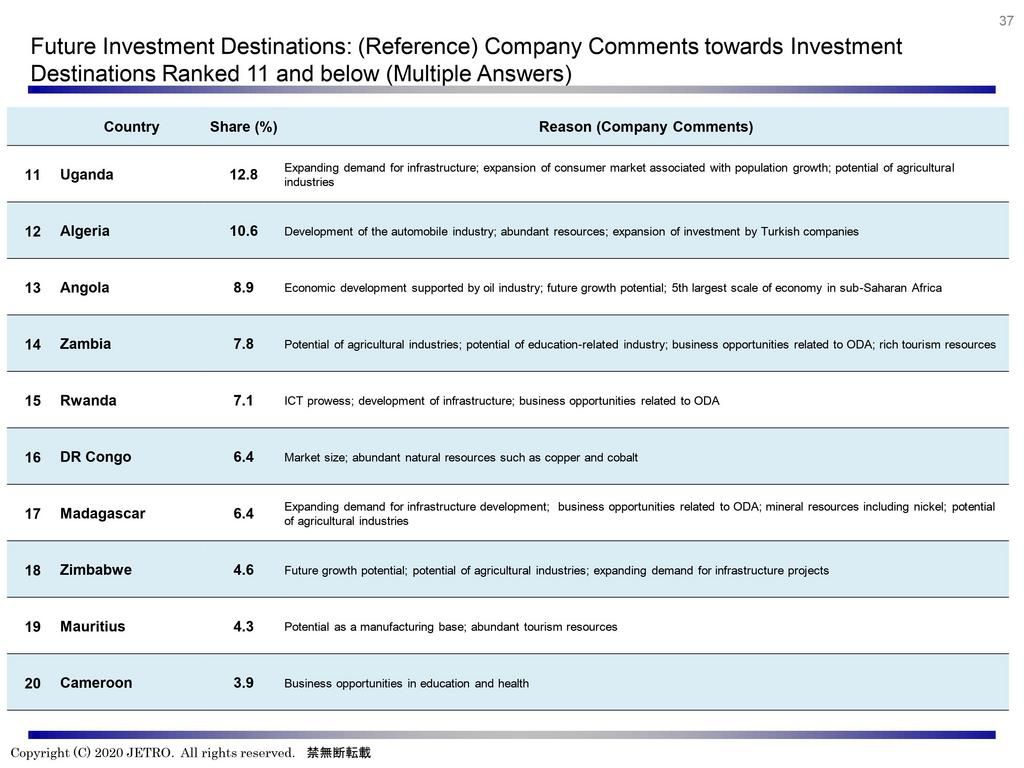 Ethiopia was ranked fourth due to its high growth rate and population size, inexpensive labour, cheap electric power, increase in companies in the textile industry, the development of light industry, ODA/investment projects, distribution in East Africa, and privatisation of state enterprises.
