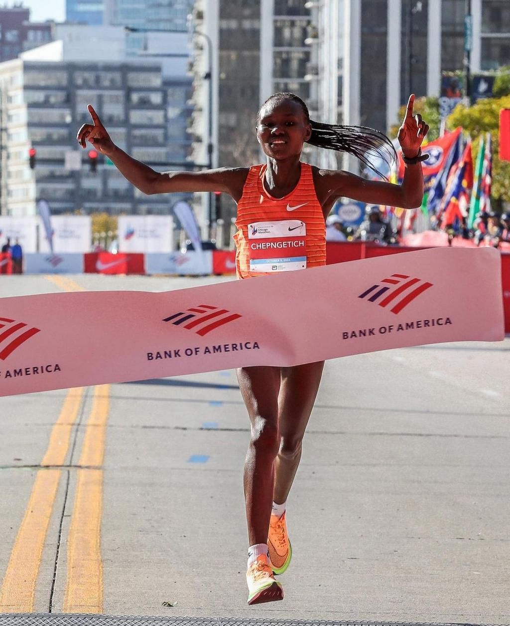 Ruth Chepng'etich cuts the tape to win the 2022 Chicago Marathon/COURTESY