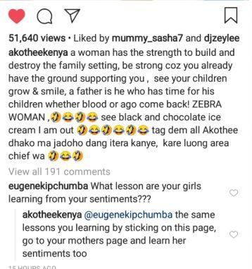 “@eugenekipchumba the same lessons you learning by sticking on this page, go to your mother’s page and learn her sentiments too,” said Akothee.