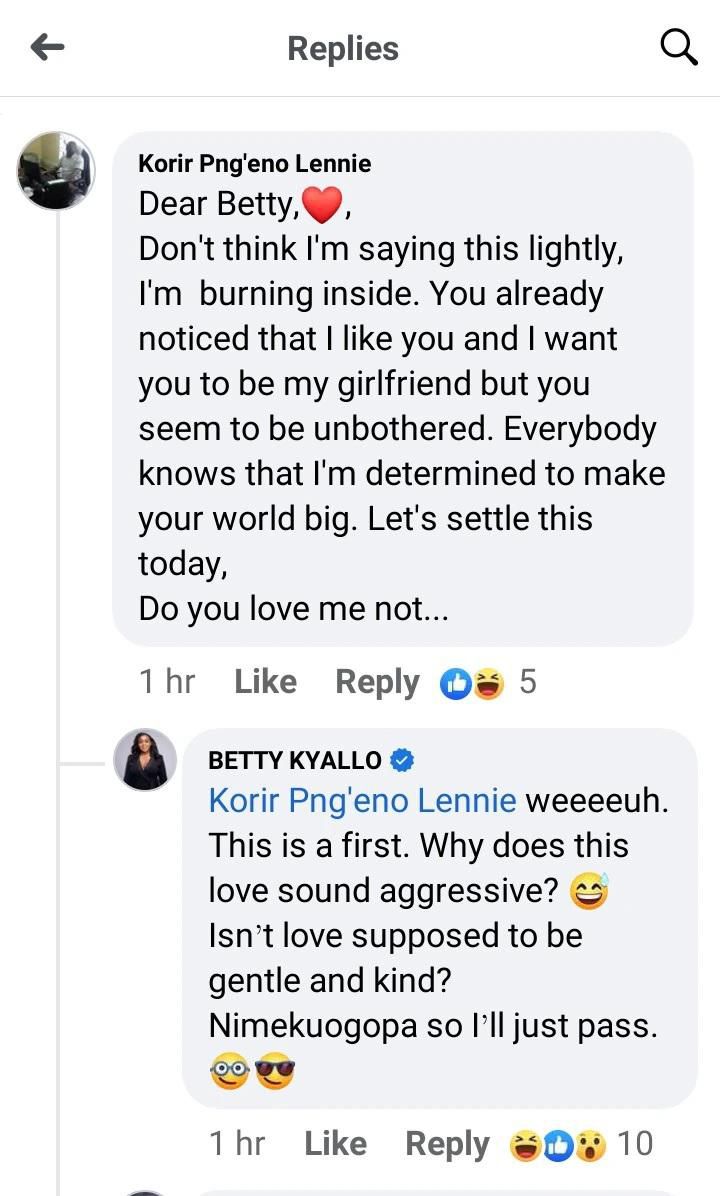 “Korir Png’eno Lennie weeeeuh. This is a first. Why does this love sound aggressive? Isn’t love supposed to be gentle and kind? Nimekuogopa so I’ll just pass,” Betty Kyallo responded.