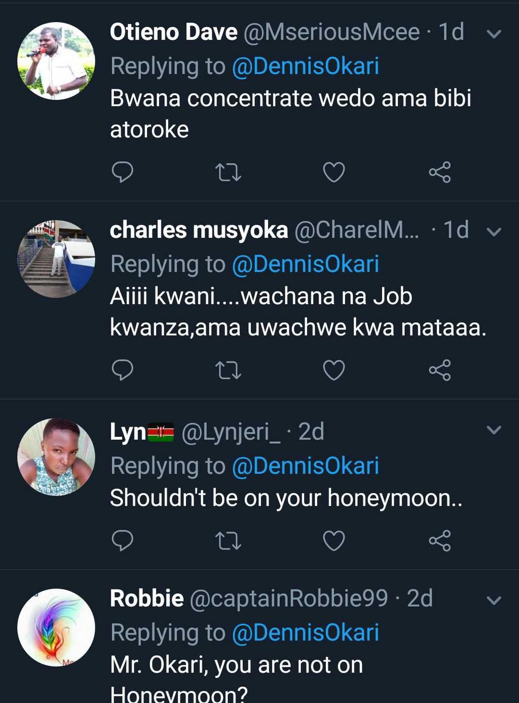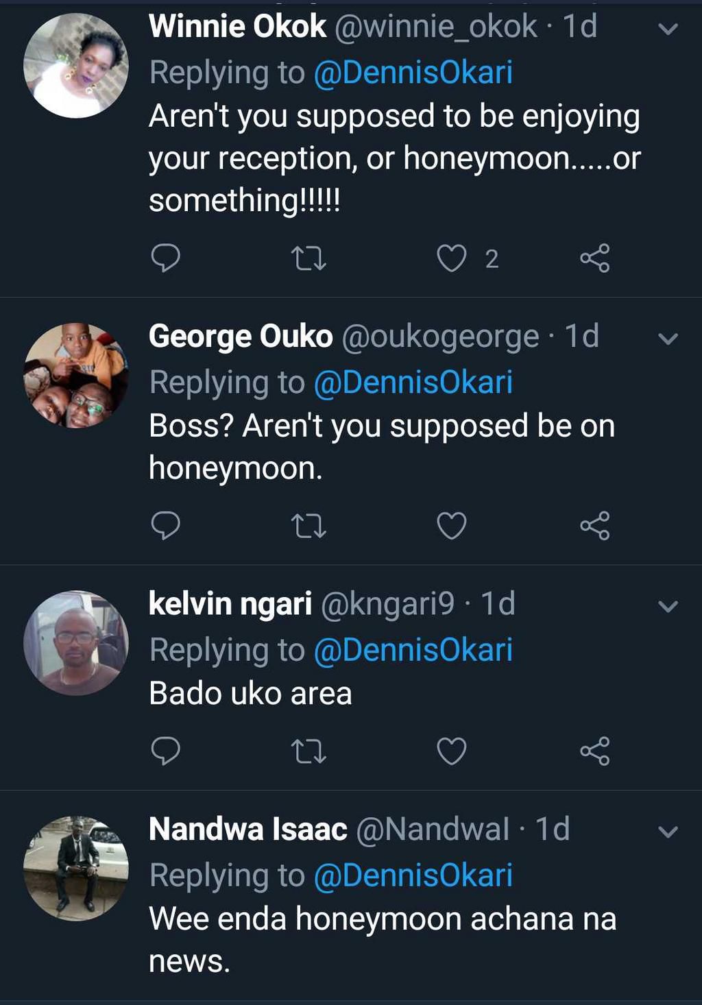 Kenyans took to Twitter to advise Dennis Okari on how to have a good time after his account continued posting work-related stuff when he was supposed to be on his honeymoon.