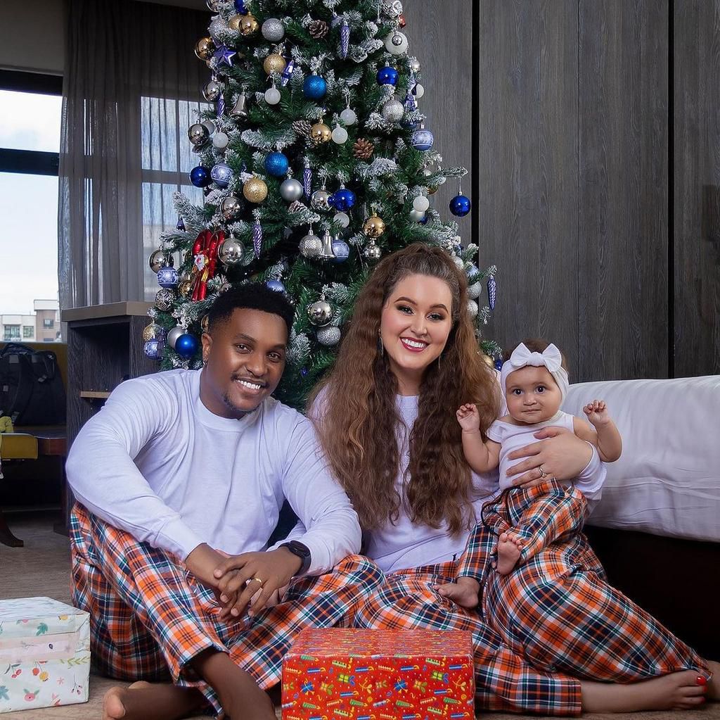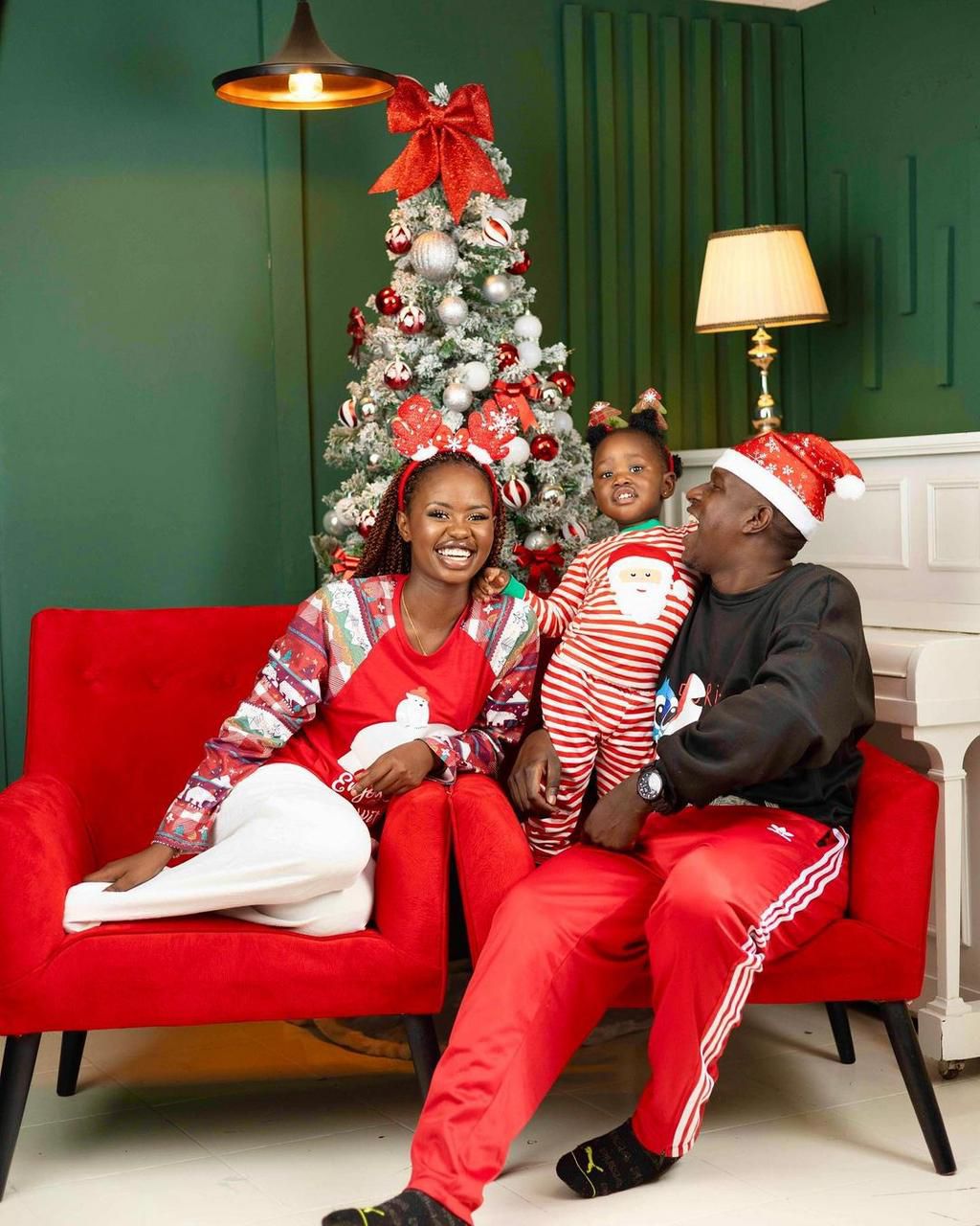 Actor Lenana Kariba and his sweetheart Hellen, joined by their daughter Ava, opted for matching white T-shirts paired with cute multicolored Christmas pajamas.