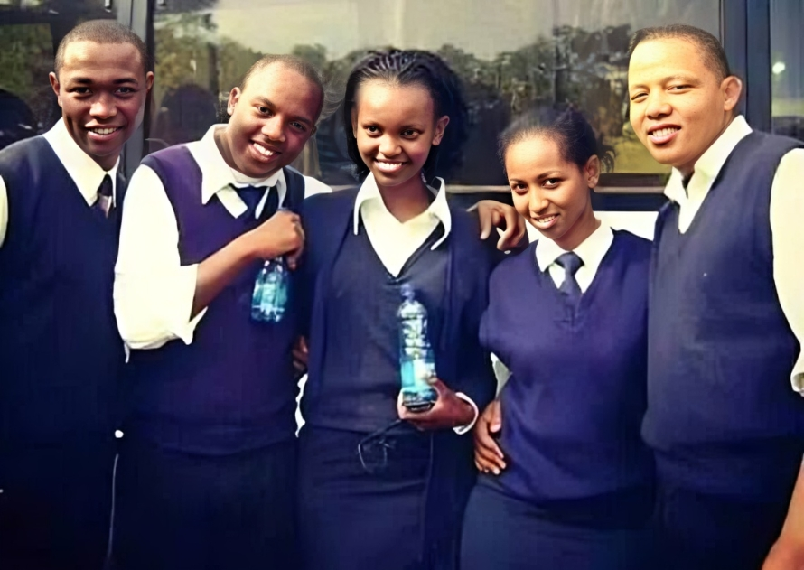 Past photo of Abel Mutua, Sarah Hassan, Denis Mugo, and other cast members of 'Tahidi High' series