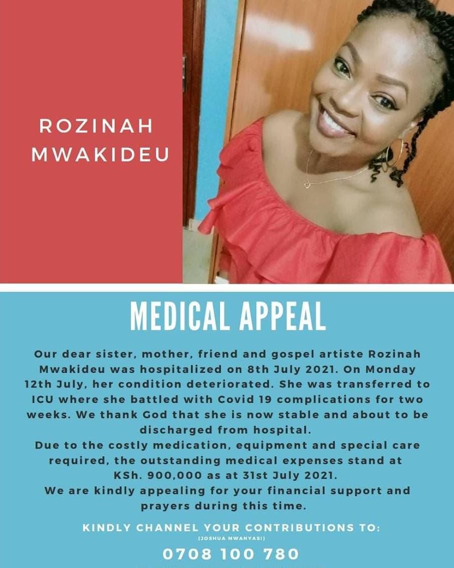 Gospel singer Rozinah Mwakideu has sent out a medical appeal to well-wishers to help her settle her accruing hospital bill, which currently stands at over Sh900, 000.