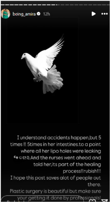 In her posts, Amira revealed that Lucy’s intestines were perforated during the procedure. Lucy reportedly returned to the clinic the same day she was discharged due to unbearable pain, only to find no doctors available.