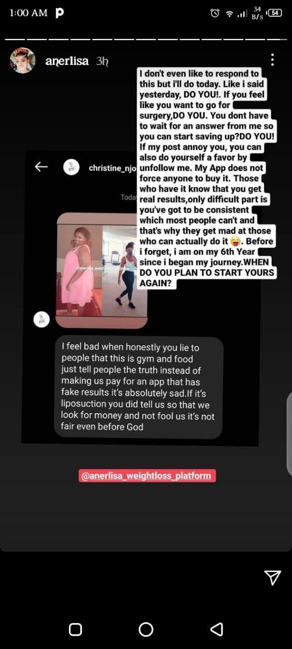 “I don’t even like to respond to this but I’ll do it today. Like I said yesterday, DO YOU! If you feel like you want to go for surgery, DO YOU. You don’t have to wait for an answer from me so you can start saving up? DO YOU! If my posts annoy you, you can also do yourself a favour by unfollowing me. My App does not force anyone to buy it. Those who have it know that you get real results, only difficult part is you’ve got to be consistent which most people can’t and that’s why they get mad at those who can actually do it. Before I forget, I am on my 6th year since I began my journey. WHEN DO YOU PLAN TO START YOURS AGAIN?” said Anerlisa.