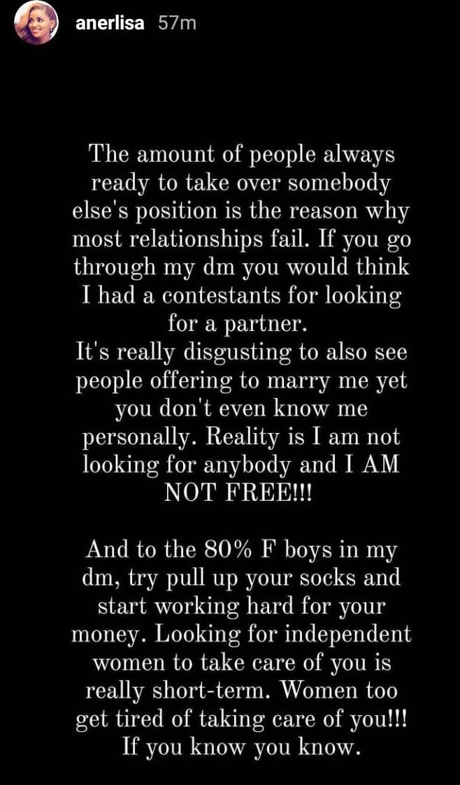 “The amount of people always ready to take over somebody else’s position is the reason why most relationships fail. If you go through my DM, you would think I had a contest for looking for a partner. It's really disgusting to also see people offering to marry me yet you don't even know me personally. Reality is I am not looking for anybody and I AM NOT FREE!!!," read part of Anerlisa's post.