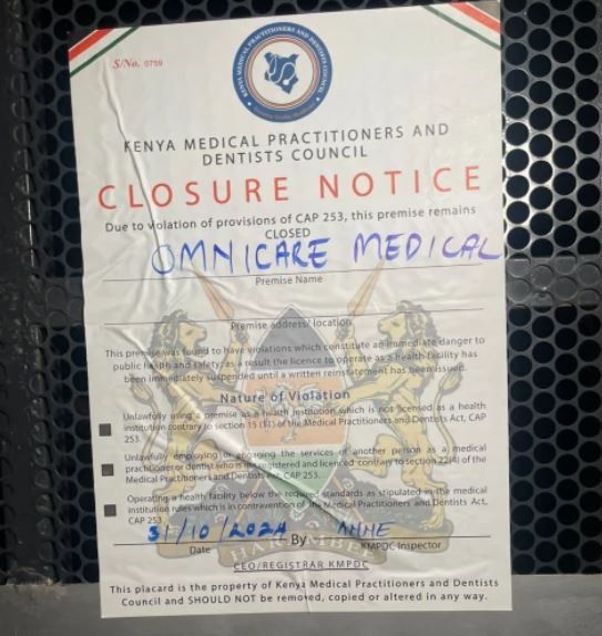 Health Principal Secretary Mary Muthoni confirmed that the facility had been closed for significant non-compliance with medical institution regulations.