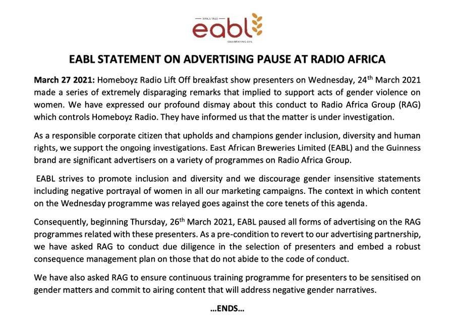 “Consequently, beginning Friday, 26th March 2021, EABL has paused all forms of advertising on the Radio Africa Group programmes related with these Presenters. As a pre-condition to revert to our advertising partnership, we have asked RAG to conduct due diligence in the selection of presenters and embed robust consequence management plan on those that do not abide to the code of conduct," read part of the statement.