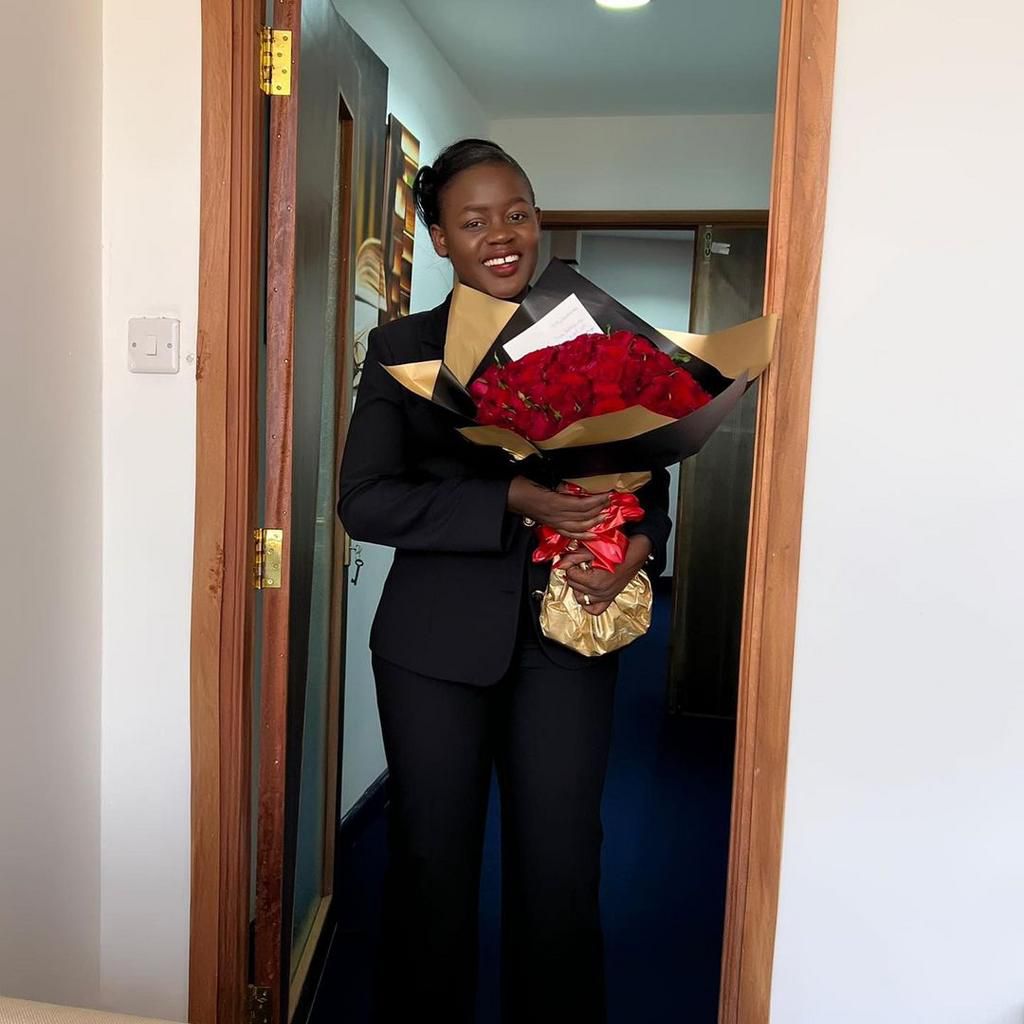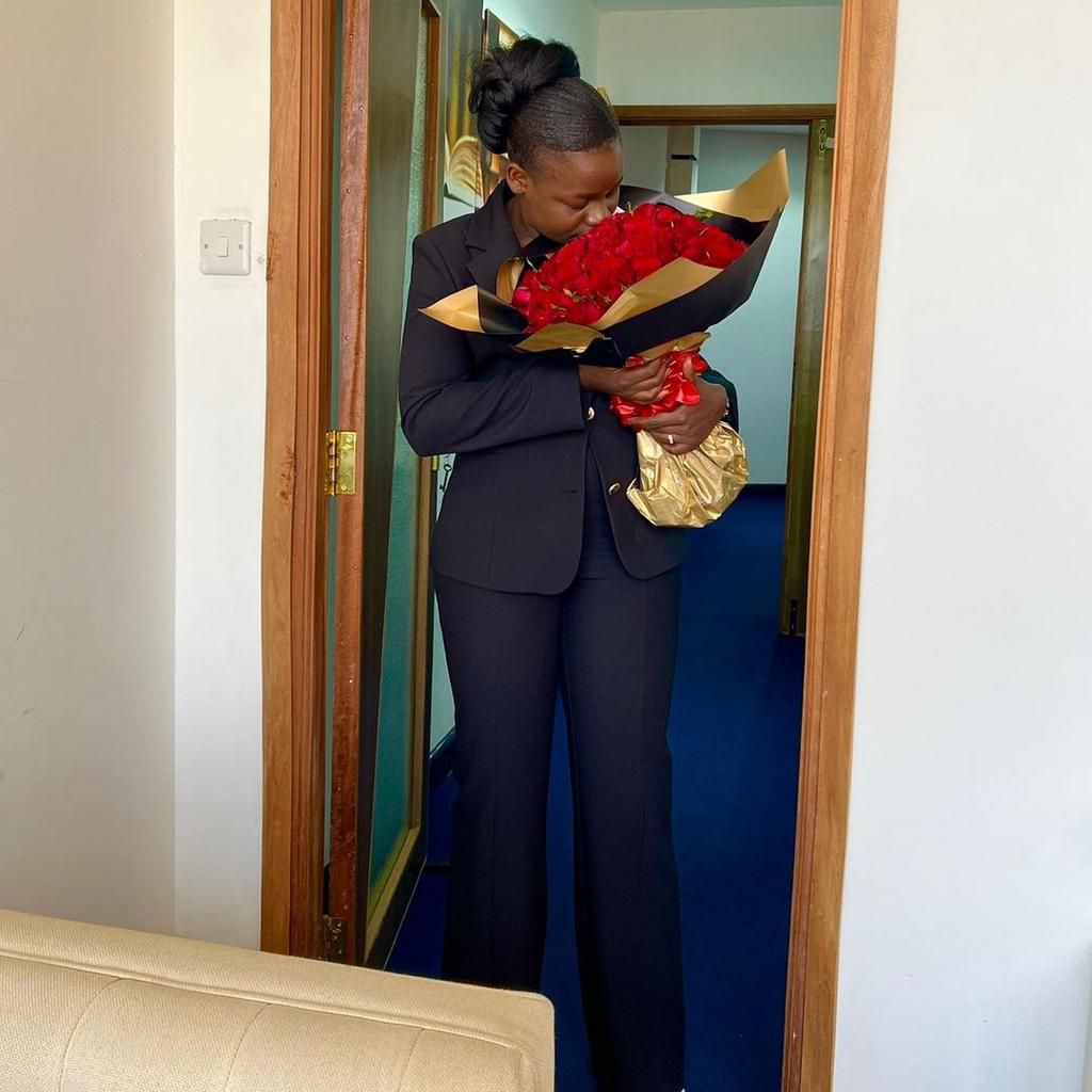 The pictures on her Instagram account show an excited Cebbie Koks carrying a bouquet from her husband Steve Ogolla.