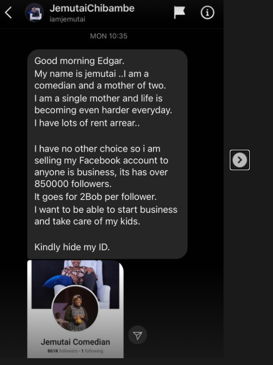 “My name is Jemutai and I am comedian and a mother of two. I am a single mother and life is becoming even harder every day. I have lots of rent arrears. I have no other choice so I am selling my Facebook account to anyone in business, it has over 850K followers…it goes for 2Bob per follower. I want to be able to start business and take care of my kids,” said Jemutai.