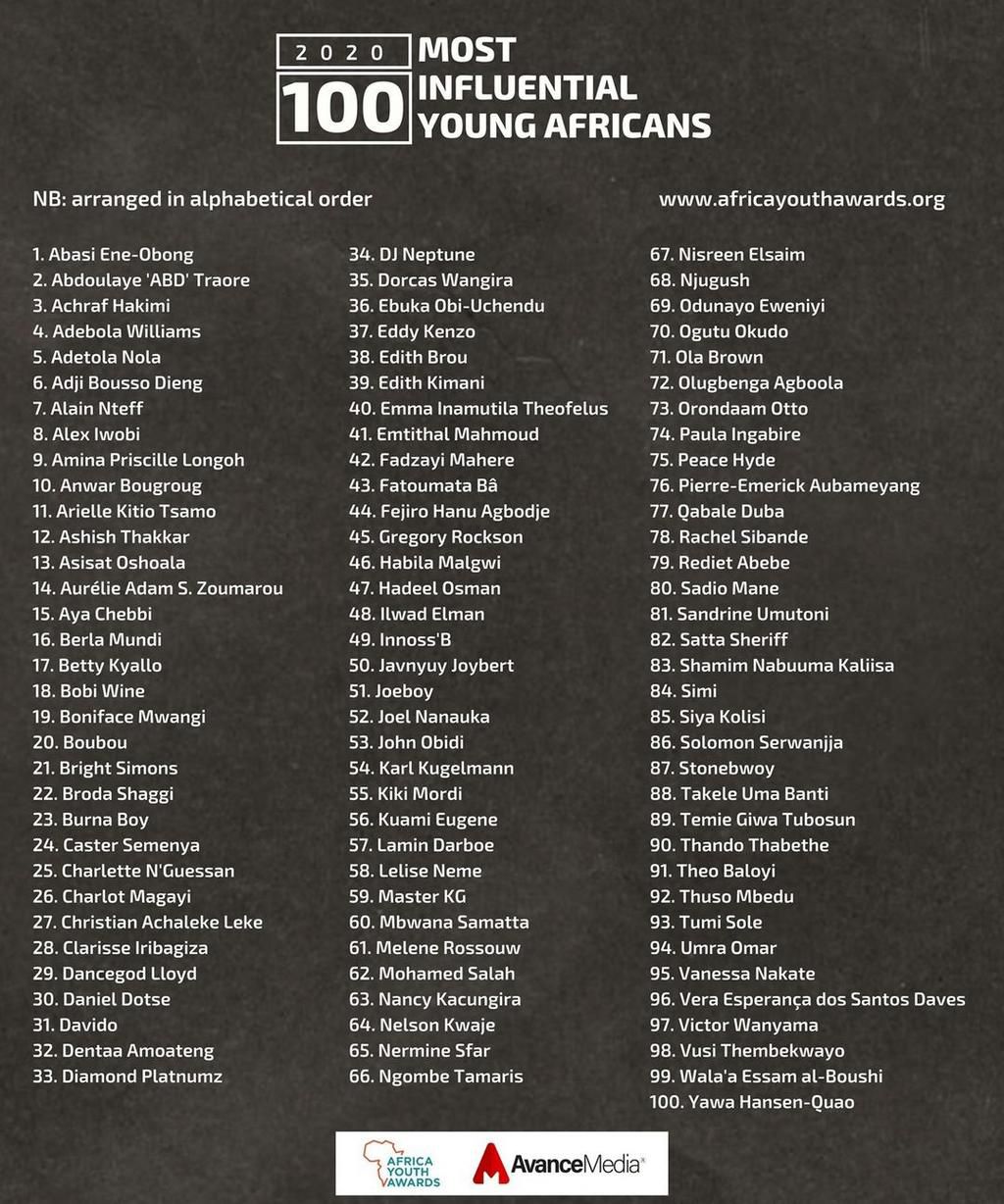 Full List of 2020 100 Most Influential Young Africans (arranged in alphabetical order)