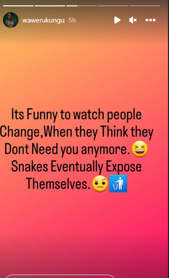 "Some people were only friends because you saw them five times a week. It's Funny to watch people Changchange they think they don't need you anymore. Snakes eventually expose themselves," Waweru wrote