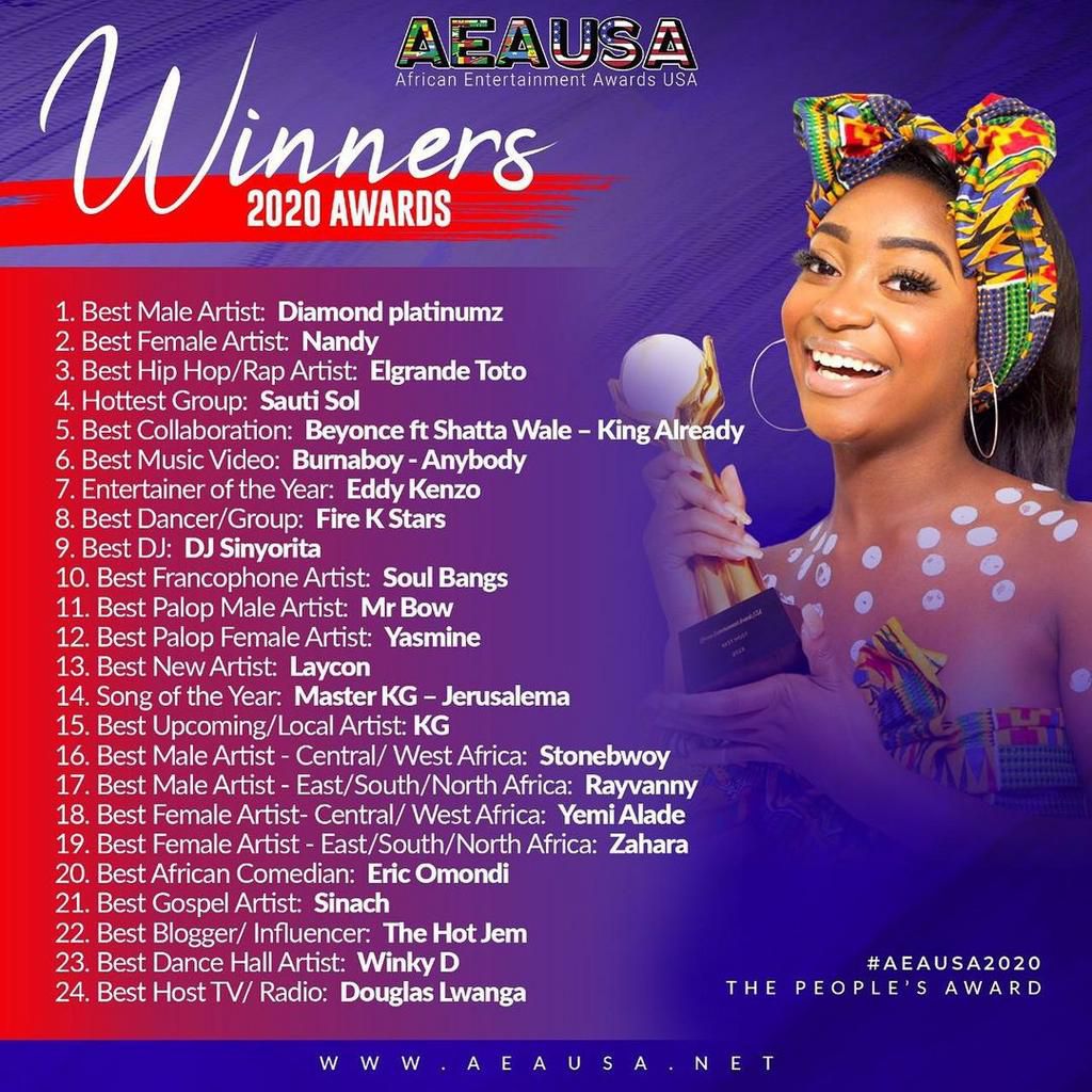 Diamond Platnumz. Full List of winners of the 2020 AEAUSA Awards
