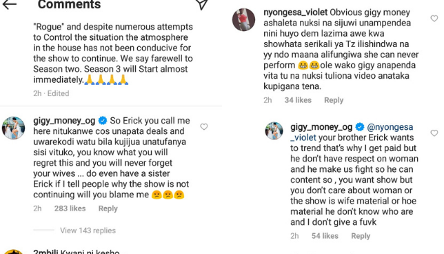 Going through Eric Omondi’s comment section, many have linked Gigy Money to the cancellation of Wife Material two.