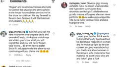 “So Erick you call me here nitukanwe cos unapata deals and uwarekodi watu bila kujijua unatufanya sisi vituko, you know what you will regret this and you will never forget your wives ... do even have a sister Erick if I tell people why the show is not continuing will you blame me 😡😡😡” wrote Gigy Money.
