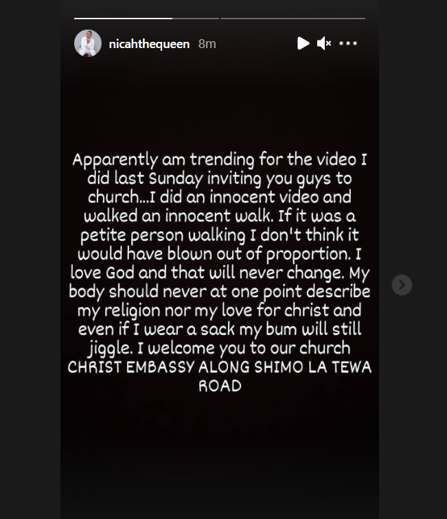 “Apparently am trending for the video I did last Sunday inviting you guys to church...I did an innocent video and walked an innocent walk. If it was a petite person walking I don't think it would have blown out of proportion. I love God and that will never change. My body should never at one point describe my religion nor my love for Christ and even if I wear a sack my bum will still jiggle. I welcome you to our church CHRIST EMBASSY ALONG SHIMO LA TEWA ROAD. #JESUSGURL Wrote Nicah the Queen.