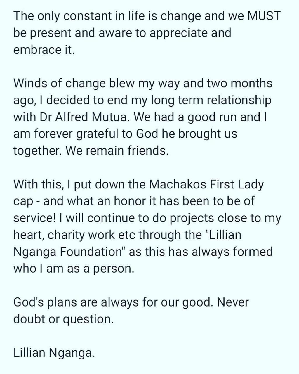 "I decided to end my long-term relationship with Dr Alfred Mutua. We had a good run and I'm forever grateful to God he brought us together. We remain friends," she says.
