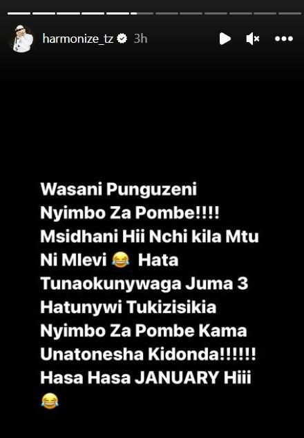 “Wasani punguzeni nyimbo za pombe!! Msidhani hii nchi kila mtu ni mlevi hata tunaokunywaga Jumatatu hatunywi tukisikiza nyimbo za pombe kama unatonesha kidonda Hasa hasa January,” Harmonize wrote.