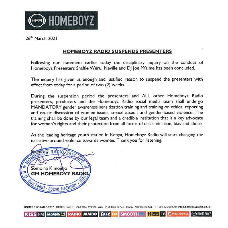 During the suspension period, all Homeboyz presenters, producers and their social media team will undergo Mandatory gender awareness sensitization training and training on Ethical reporting and on air discussion of women issues, sexual assault and gender-based violence.