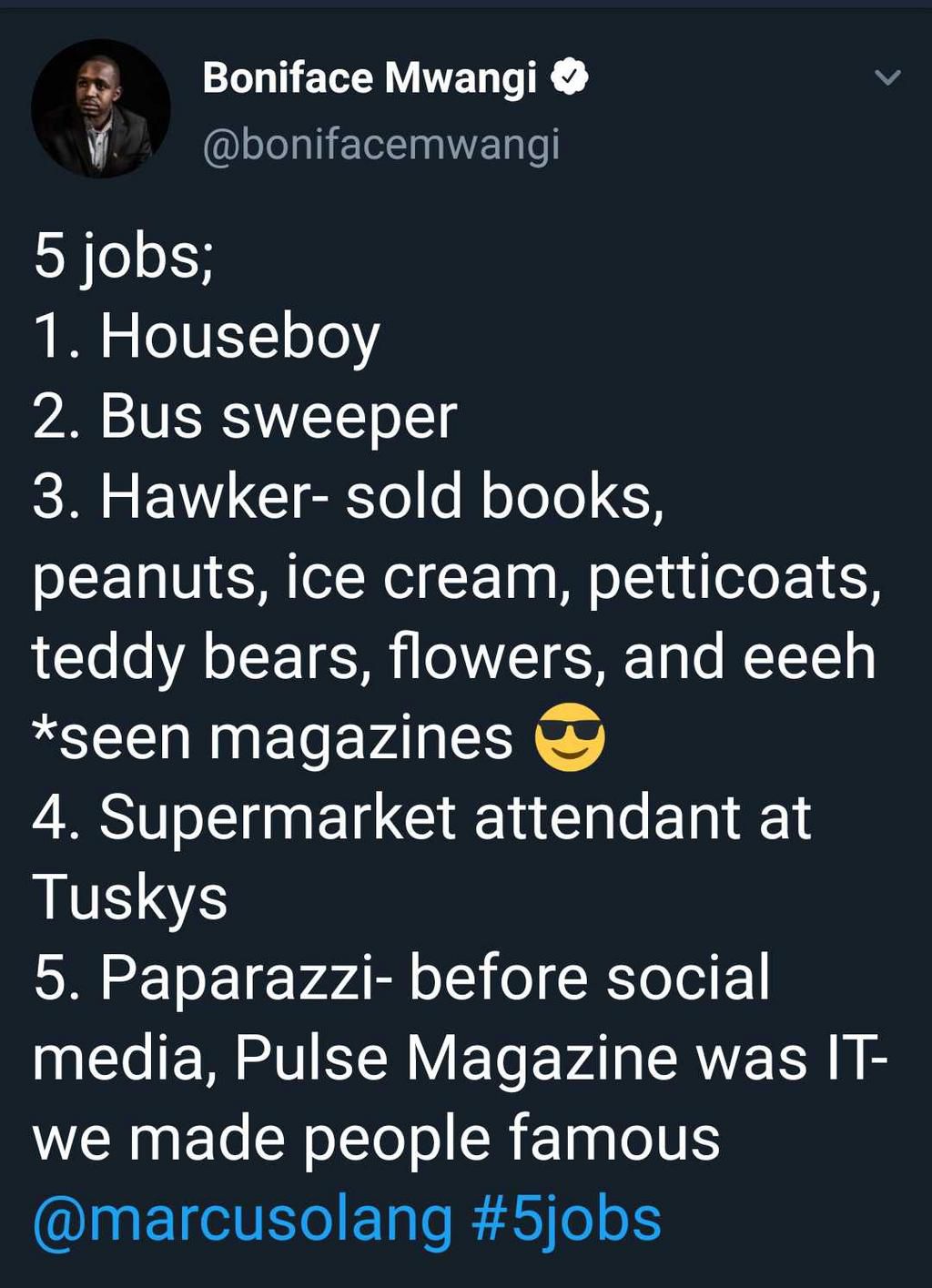Commenting on the 5 Jobs challenge that has been doing rounds on Twitter, Boniface wrote “5 jobs; 1. Houseboy 2. Bus sweeper 3. Hawker- sold books, peanuts, ice cream, petticoats, teddy bears, flowers, and eeeh *seen magazines 4. Supermarket attendant at Tuskys 5. Paparazzi- before social media, Pulse Magazine was IT- we made people famous @marcusolang #5jobs”
