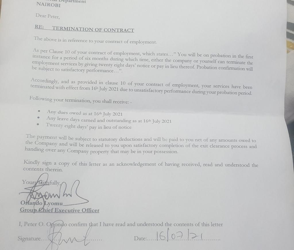 There was no formal appraisal or feedback, there was no documentation or minutes about my alleged performance shortcomings, there was never discussion with or feedback from my boss, there was no PIP. Just a sacking letter. The HR honcho just told me my boss didn't think I was the right person for the job. Fair enough, every boss is entitled to their own opinion. What about facts?” reads Part of Peter Opondo’s post.