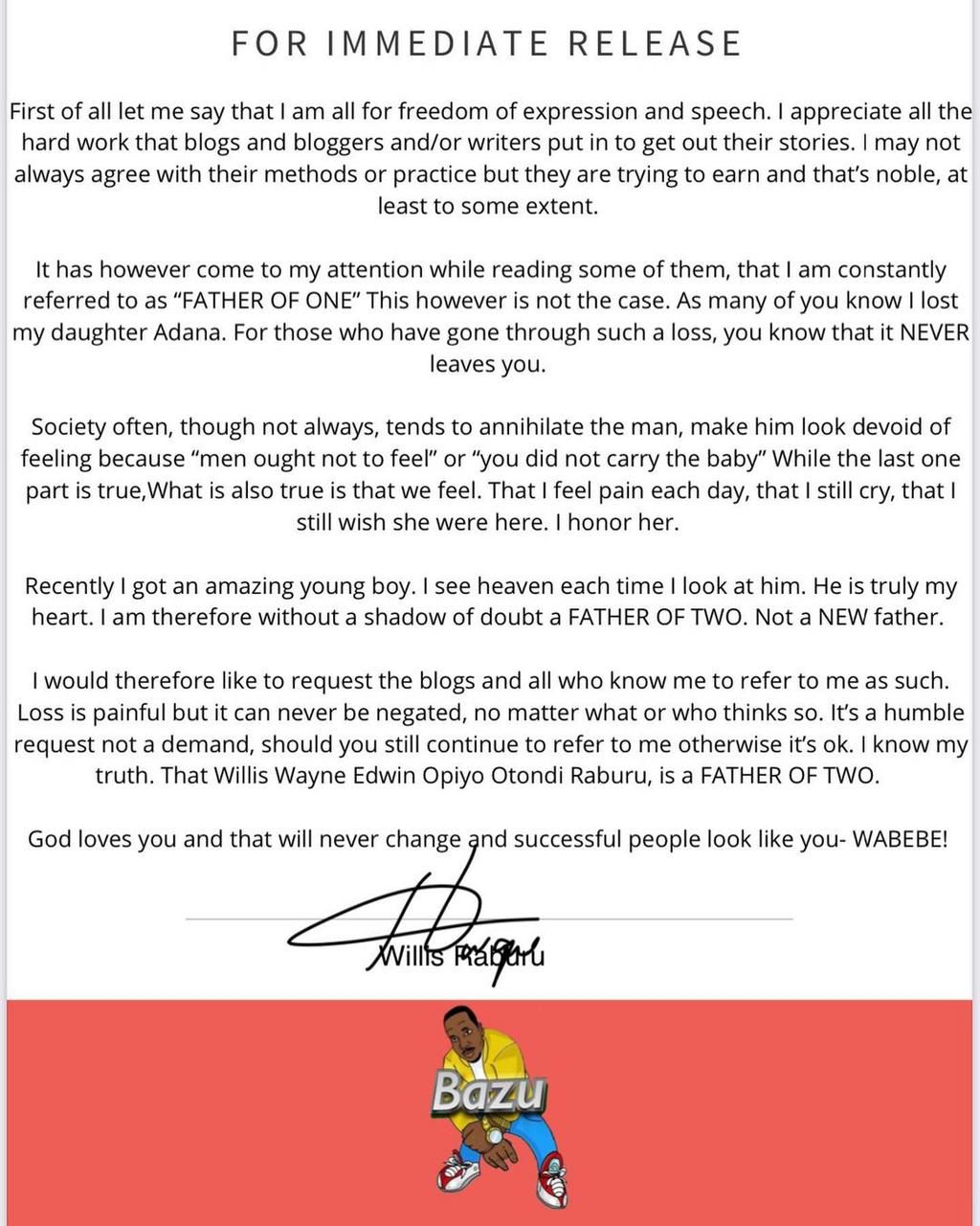 I would therefore like to request the blogs who know me to refer to me as such. Loss is painful but can never be negated, no matter what or who thinks so. It’s humble request not a demand, should you still continue to refer to me otherwise is Ok. I know my Truth. That Willis Wayne Edwin Opiyo Otondi Raburu is a father of Two” wrote Willis Raburu.