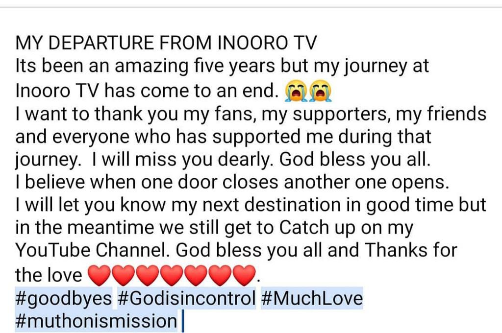 It’s been an amazing five years but my journey at Inooro TV has come to an end. I want to thank you my fans, my supporters, my friends, and everyone who has supported me during that journey. I will miss you dearly. God bless you all," she said.