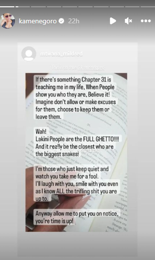 In her Instagram stories, Kamene warned her haters that she will no longer tolerate their deceitful behaviour.