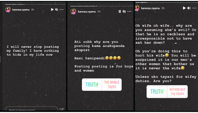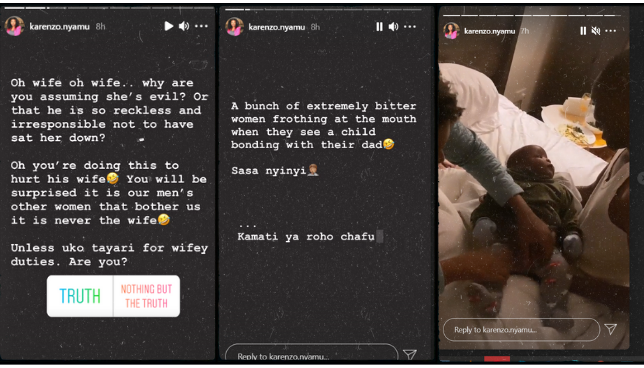 In number of posts shared via her Insta-stories, Ms Nyamu wondered why Netizens are bitter to see Samidoh bond and take care of his own son.