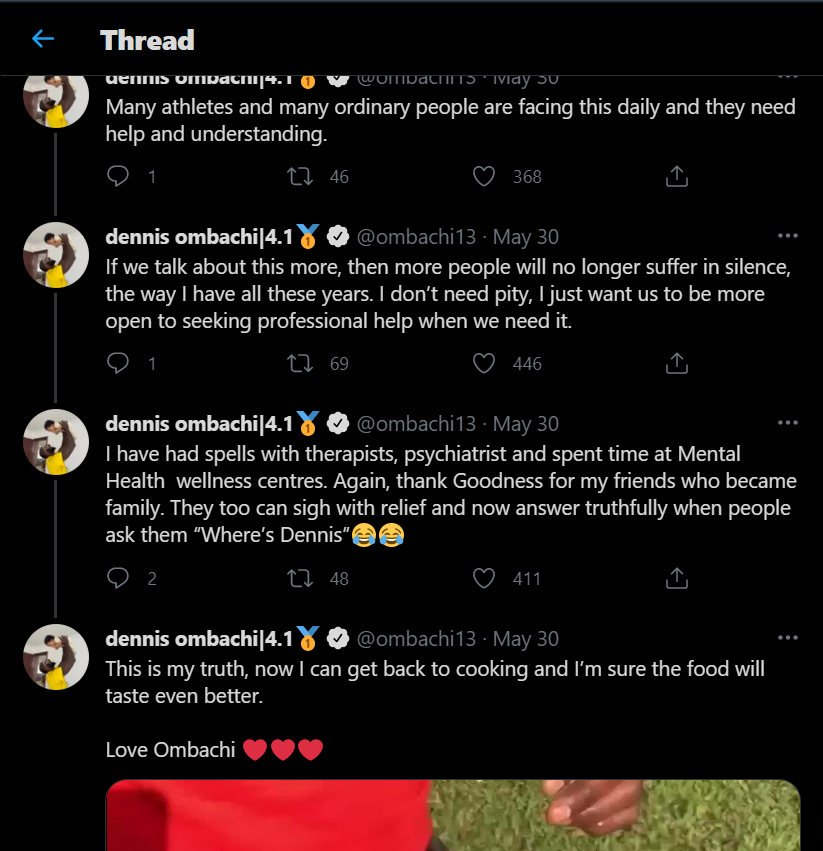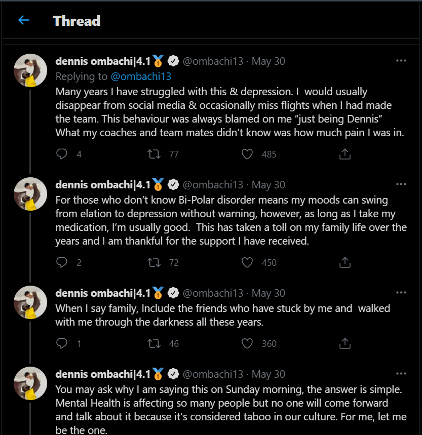 “Many years I have struggled with this & depression. I would usually disappear from social media & occasionally miss flights when I had made the team. This behaviour was always blamed on me “just being Dennis” What my coaches and team mates didn’t know was how much pain I was in” said Ombachi in part.