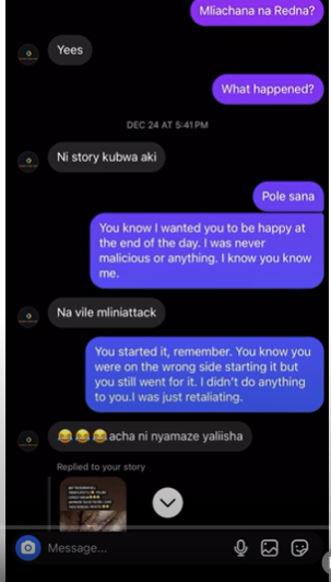 Redna swiftly responded, asserting in a separate interview with Nicholas Kioko that it was Sam who betrayed her trust. She claimed to have discovered incriminating messages on his phone.