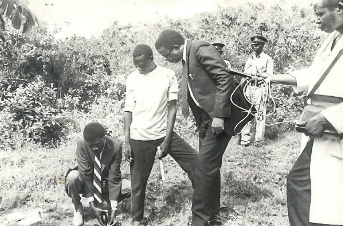 1991: Justice Evans Gicheru, 3rd from left, Chairman of the Ouko Murder Commission of Inquiry, examines the spot on the foot of Got Alila hill in Kisumu where remains of former Foreign Affairs Minister Robert Ouko were found