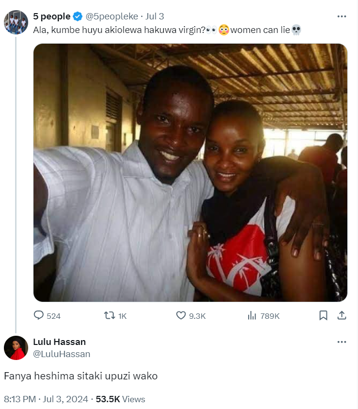 The controversy began when an X user named Kevin, operating under the handle @5People, shared an old photo of Lulu Hassan with another man.