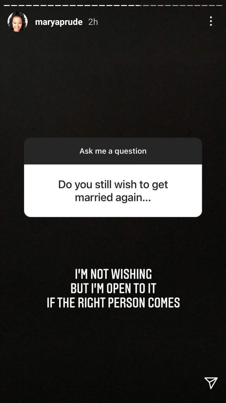 Marya Prude Ngami failed to rule out possibilities of getting married again barely 2 years after her failed marriage with Citizen TV’s Willis Raburu.