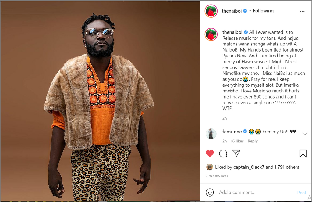 “All I ever wanted is to Release music for my fans. And najua mafans wana shanga whats up wit A Naiboi!! My Hands been tied for almost 2years Now” said Naiboi in part.