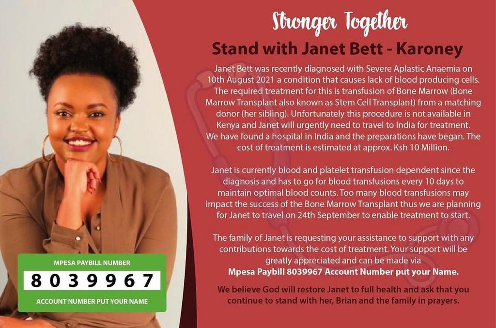 The family also said that Janet Bett was diagnosed with severe Aplastic Anaemia on August 10th, 2021 and since then she has been going for blood transfusion after every 10 days.