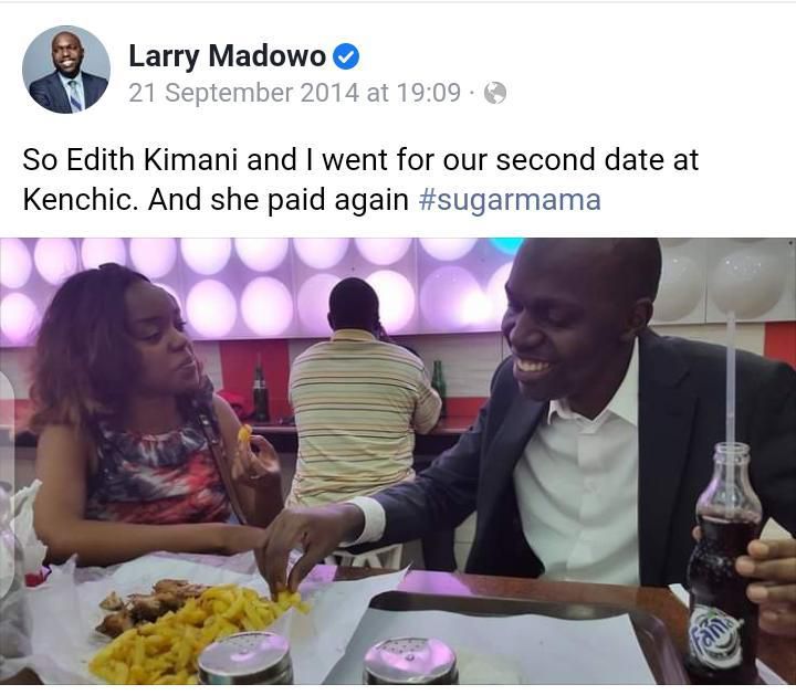 "So Edith Kimani and I went for our second date at Kenchic. And she paid again #sugarmama," Larry's caption read.