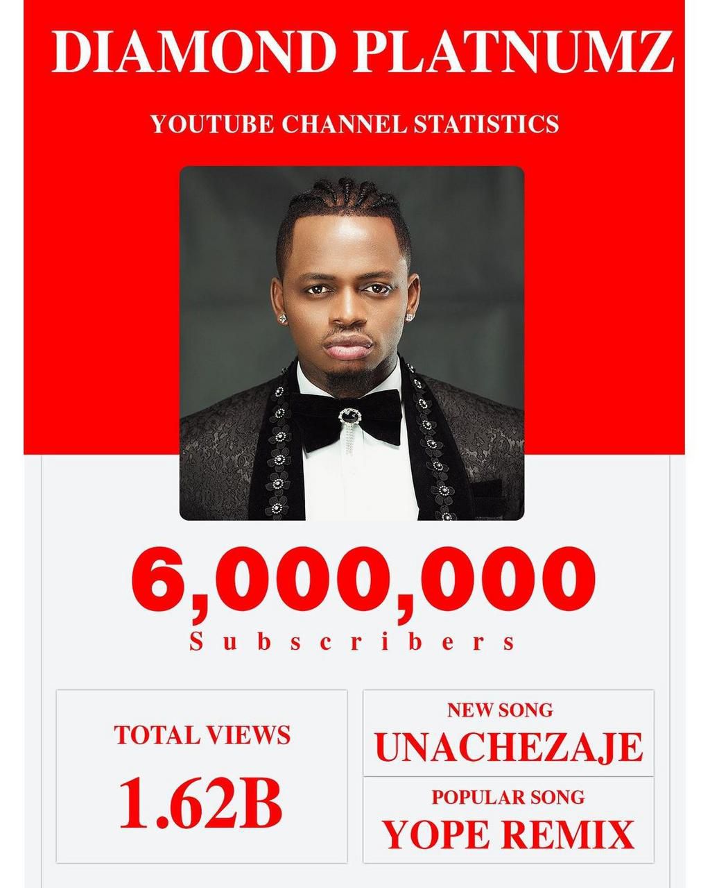 WCB President Naseeb Abdul Juma aka Diamond Platnumz has made another milestone in his music career after surpassing the 6 million subscribers mark on YouTube.